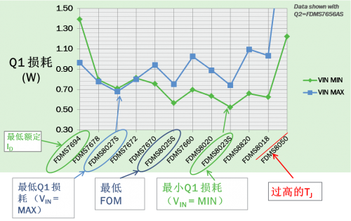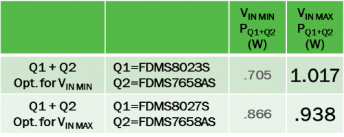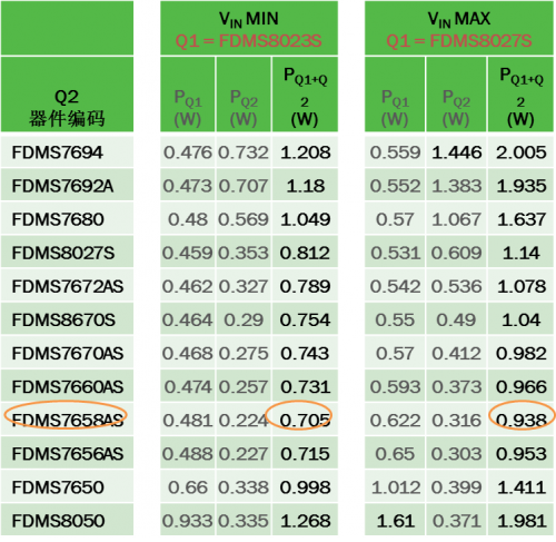 為優化轉換器能效,首先根據VIN選擇損耗最小的Q1,然后選擇產生損耗最小的Q2。本例中, 無論VIN最小或最大,最佳的Q2是相同的,都為FDMS7658AS(但并不總是如此,特別是具有寬VIN范圍或高FSW時)。