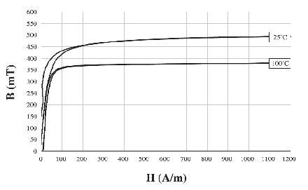 我們在設計反激變壓器以及一些儲能電感時,設定最大磁通量Bm尤為關鍵。由于電源起機和短路保護時最大磁通量Bm大于穩態工作時的Bm,所以我設定變壓器的Bm時需要預留足夠的裕度。如圖 1所示,磁芯溫度為100℃曲線可知Bm=0.35T時磁芯接近飽和,所以出于對電源起機、輸出過流和短路等極限情況考慮,鐵氧體P4材質的變壓器的穩態Bm一般小于0.25T。