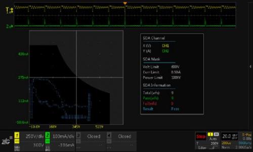 示波器的測試應用非常簡單,使用電壓、電流探頭正常測試開關管的VDS和IDM,并打開SOA分析功能,對照數據手冊的SOA數據設置好示波器的SOA參數即可。一但波形觸碰到安全區以外的區域,就說明器件超額工作,存在危險。