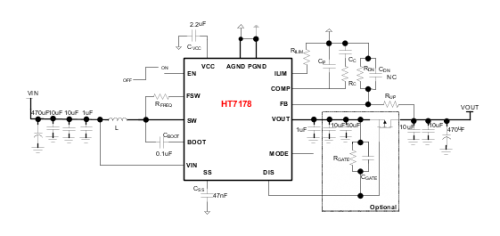 ①.HT7178的輸入電壓范圍是2.7V到15V, 輸出電壓范圍是4.5V到20V。該芯片集成了兩個低導通電阻的功率MOSFET:一個11m?6?8開關FET和一個13m?6?8整流器FET,使用具有集成斜坡補償功能的固定頻率峰值電流模式控制。HT7178 PFM,PWM兩種模式可選,匹配不同的應用場合,提高效率。