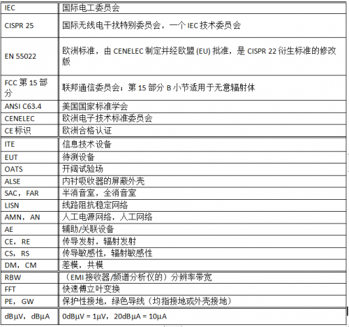 表 1:與 EMI 和 EMC 相關的常見縮略語、縮寫和單位。